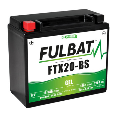 - La batterie FULBAT FTX20-BS fait partie de la gamme gel. Spécialement conçue pour offrir des performances et une sécurité maximales, cette batterie 12V 18,9Ah est prête à l'emploi et ne nécessite aucune manipulation d'acide, préparation initiale ou entretien.